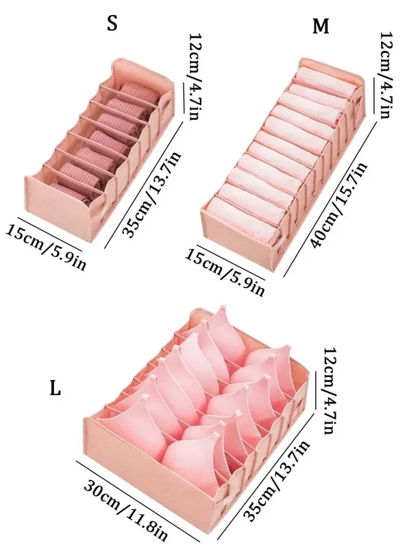 There are three designs of this product with different amount of compartments in three different sizes, - making it specifically suitable to store bras, panties, and socks.